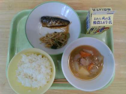 今日の給食は、牛乳、ごはん、いわしの土佐煮、ごま和え、豚肉とじゃがいもの南蛮煮です。