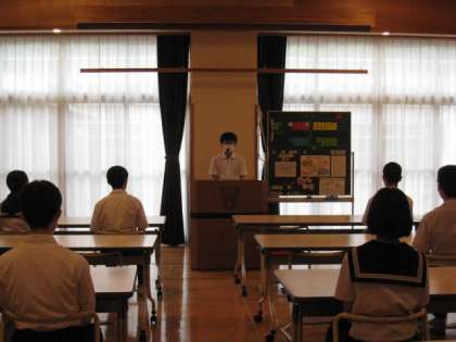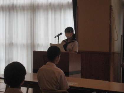 生徒会長、副会長の立候補者及び応援弁士が演説を行いました。演説会は厳かな雰囲気で進められ、演説をする側の生徒の態度や、それを聞く生徒の様子からも、山田中学校をよりよくしていこうという気持ちが感じられました。