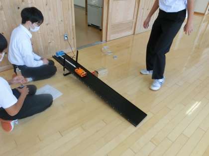 物体の運動の速さを詳しく調べるには、どうしたらよいか。斜面を下る台車にはたらく力と速さの変化を実験しました。