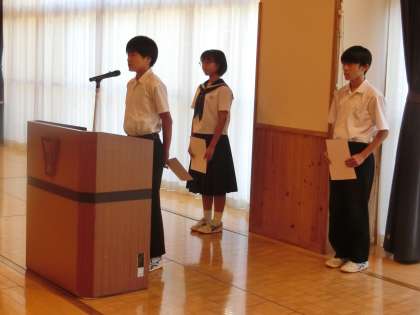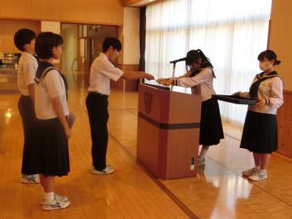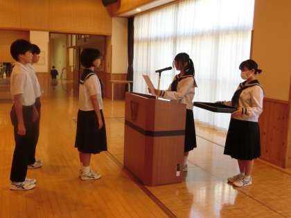 新生徒会長が、新広報委員長、新保健美化委員長、新給食委員長を委嘱しました。生徒会活動の中心が2年生へ引き継がれました。