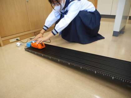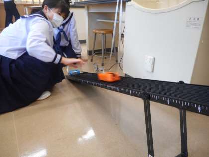 授業開始時に、各班で速度メーターを使い、傾斜面の3カ所の速度を計り、前回の学習を確認しました。本日の学習課題は、「斜面を上る物体は、どのような運動をするのか」です。前回の実験から、下る台車を上る台車に変えて、記録テープの測定から学習課題を考えます。