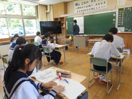 本日の授業は、「連立方程式とグラフ」です。連立方程式をグラフに記入し、交点を見付けることで、解を求めます。どの生徒も色を使ってグラフをかき、分かりやすいノートづくりを心がけています。