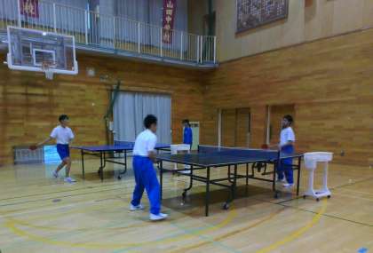放課後の体育館では、バレーボール部と卓球部が活動しています。