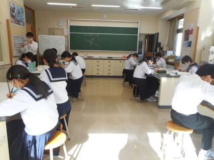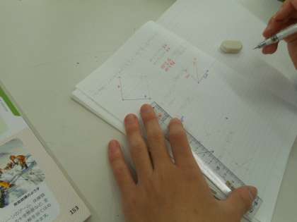 本日の授業は、「斜面上の物体にはたらく力の分解」について考えます。前授業で力の合成・分解について学習しました。それを基に、斜面での垂直抗力と重力の作図から、はたらく力の分解を考えます。