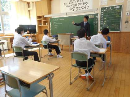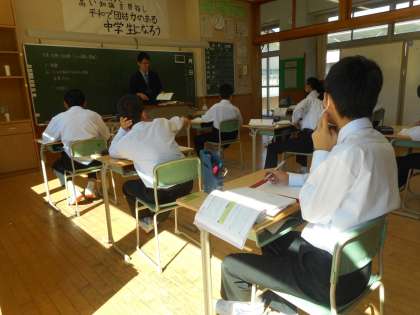 本日の授業は、「関数」です。空のプールに2時間後、20センチの深さの水がたまっていた時の2つの数量、時間と深さの関係について、考えます。生徒は、小学校で学んだ学習を基に、教科担任の質問に元気よく答えていました。
