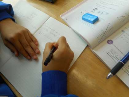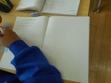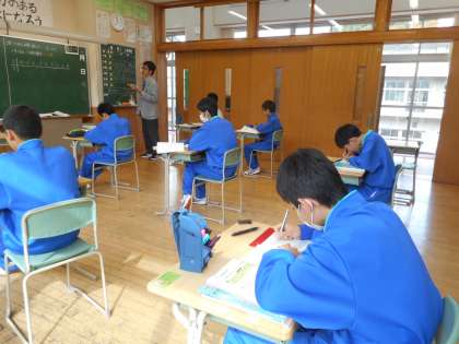 本日の授業は、比例の性質と調べ方です。比例式y=axについて、xの変域を負の数までにしても、比例の性質が成り立つかを表にして確認します。1年生は、午後のりんご収穫体験に備えて、授業を体育服で受けました。