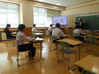 本日の授業は、許可を求めたり依頼したりするときの表現について学習します。生徒は教科担任に、小学校で覚えた英単語と同じ意味の新出単語について、使い方の違いを確認しました。