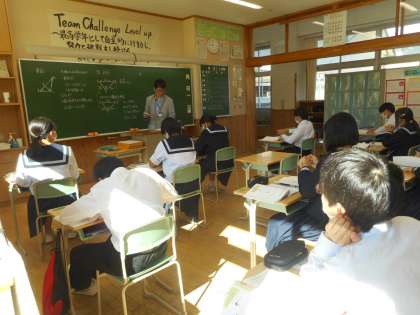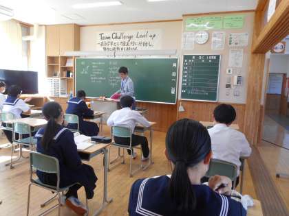 本日の学習は、「相似な図形」です。実際に、測定できない距離や高さを縮図をかいて求めます。まず、相似する図形をかき、対応する辺の比から、実際の池の距離を求めます。生徒に単位を揃えて計算する力が求められます。