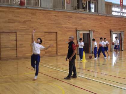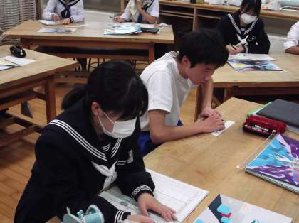 1年生はバスケットボールのシュート練習、2年生は古文の内容把握、3年生は美術で完成した作品の振り返りをしています。