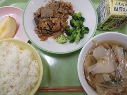 今日の給食は、スタミナレバー丼、牛乳、ワンタンスープ、ゆでブロッコリー、りんごです。