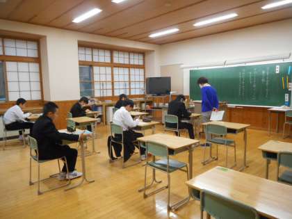 本日の授業は、文法「言葉の単位・文の組み立て」についてプリントを用いて学習します。初めに文の中の、文節数と単語数を復習します。分からない問題は、教科担任と確認しながら理解を深めます。