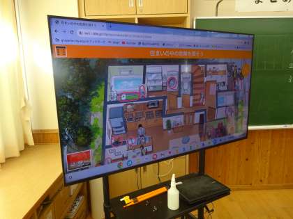 2年生は、家庭科の授業で、住まいの中の危険について考えました。教材にある危険箇所について、「どうしてここが危険なのか」と理由を聞き合い理解を深めました。