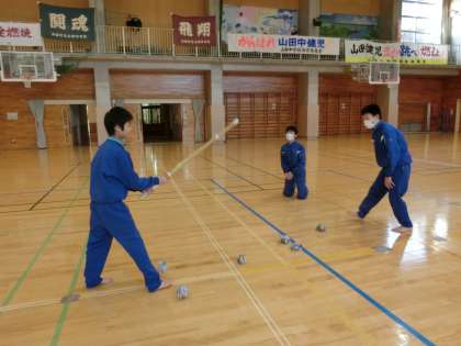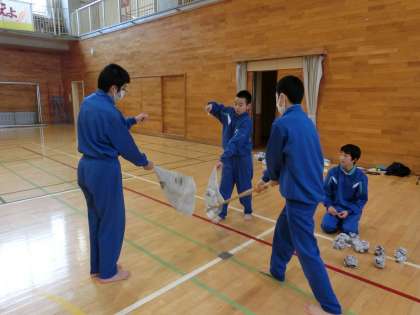 初めての剣道体験です。じゃんけんゲームで攻防の楽しさを味わいました。そして、試し切りに挑戦です。体ほぐし運動を通して、礼法や竹刀の扱い方を学びました。