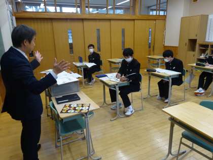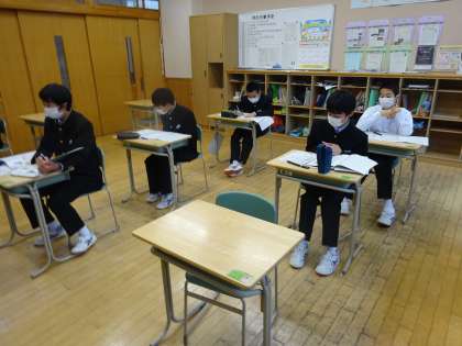 期末評価の結果が返却され、生徒は、問題の解説をよく聞いて、各解答を確認しました。