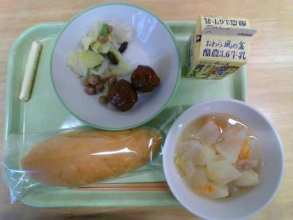 今日の給食は、牛乳、コッペパン、ミートボール、ミックスビーンズのマリネ、野菜スープ煮、棒チーズです。