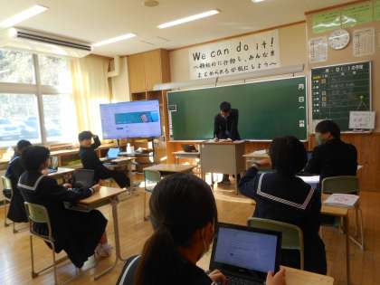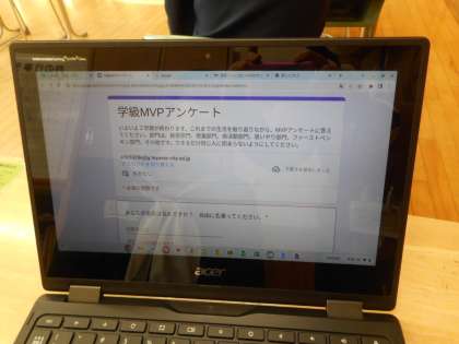 本日の学級活動は、2学期の振り返りです。生徒は、端末上のMVPアンケートの質問に丁寧に答えながら、学校生活を振り返ります。