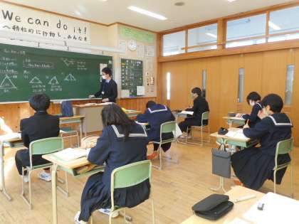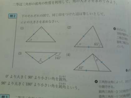 本日の授業は、二等辺三角形の性質です。前の授業で学んだ定理を利用し、角Xの大きさを求めます。角Xを求めるに当たって、生徒は教科担任からアドバイスを受け、分かる角度から図形に書き込んでいました。