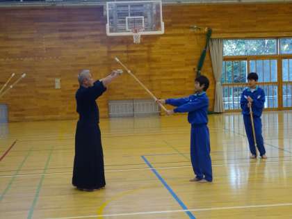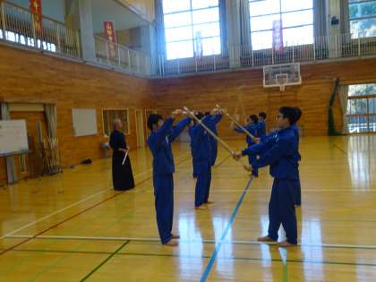 先生から面の打ち方を教わり、ペアになって相手の竹刀に向け練習をしました。正しい姿勢で打てるよう、繰り返し練習しました。