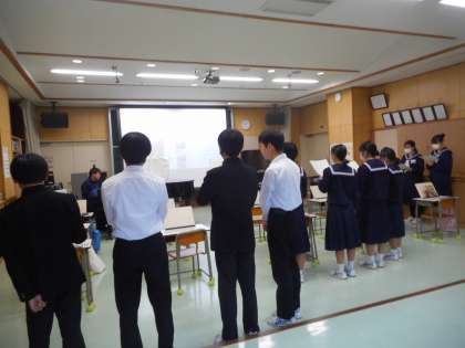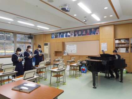 本日の授業は、卒業式での全校合唱曲の練習です。生徒が歌いたい曲を選びました。3パートに分かれて、リズム、音程を互いに確認しながら、練習を重ねます。授業の終わりに、3パートで合わせ、本日の練習の成果を確認しました。