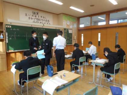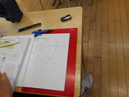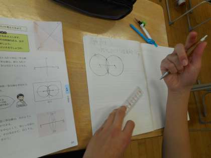 本日の授業は、垂直二等分線の作図です。作図で求めた中点が、線分の垂直二等分線上にあるかを確認します。どの生徒も、作図に意欲的に取り組んでいました。