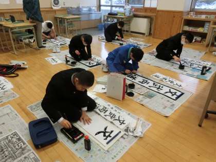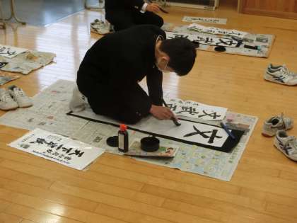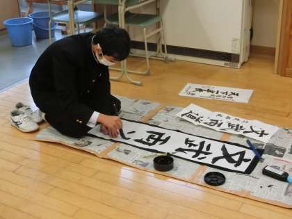 今週22日(金)が2学期終業式で、今学期のまとめの書き初め練習です。1年生の課題は、「文武両道」です。全集中して思いを込めます。