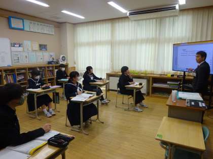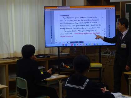 2年生の授業の様子です。発表に対するフィードバックが書かれた文を読み、意味を確認しています。to不定詞等、これまで学習した文法事項を確認しながら内容を理解しています。