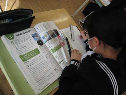 2年生は理科で「放射線はどのように利用されているのか」という学習課題のもと、放射性物質について学習しました。先生の話を聞きながら、実生活ではどういうところで使われているのかを各自で考えました。