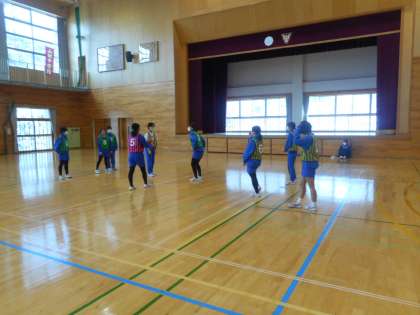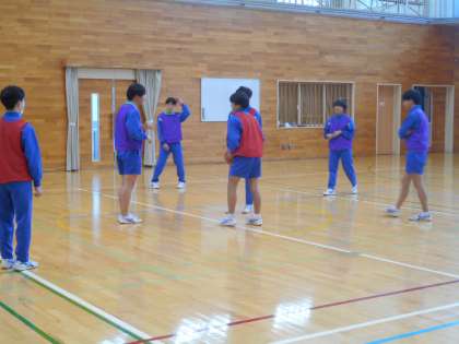 本日の学習課題は、「チームでパスをつないで、攻撃を楽しもう」です。昨日に引き続き、2、3年合同での保健体育の授業は、バスケットボールです。シュート練習した後、男女に分かれてゲーム形式で練習を重ねます。