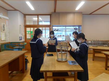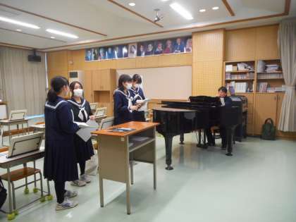本日の授業は、卒業式での全校合唱曲の練習です。3パートごとに練習を重ね、授業の終わりに全体で音合わせをしました。パートからパートへのつなぎとなる小節を重点的に練習しました。
