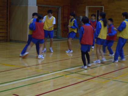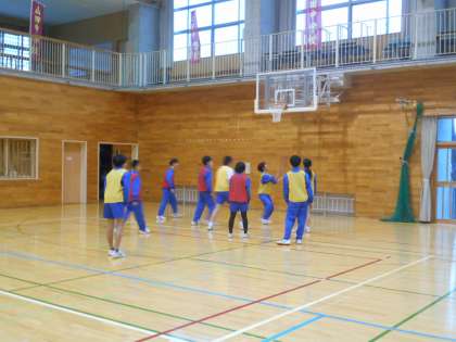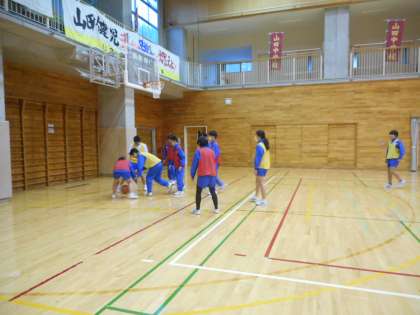 本日の学習課題は、「チームでパスをつないで、攻撃を楽しもう」です。合同の授業では、男女混合で3チームをつくり、バスケットボールを学習します。通常より人数が増えたことで、チーム間でのかけ声も自然と大きくなり盛り上がっていました。