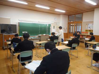 本日の学習課題は、「筆者の主張に対する自分の考えをまとめよう」です。「不便の価値を見つめ直す」著者 川上 浩司の本文から、筆者のどんな主張に賛成か、反対かをワークシートにまとめます。生徒は、落ち着いた雰囲気の中で、学習に取り組んでいました。