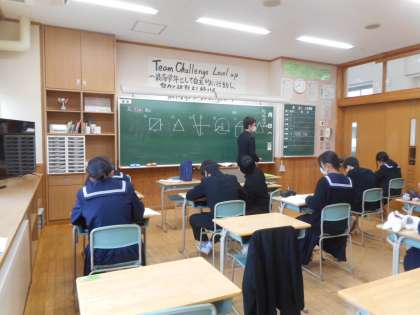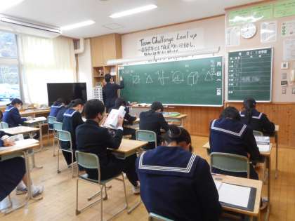 3年生は、授業開始時に受験対策問題に10分間取り組み自己採点することを継続しています。その後の授業では、基本の問題、章の問題を復習します。三平方の定理や三角形の3辺の比を利用して、三角形の辺の長さ、円の直径や体積を求めます。