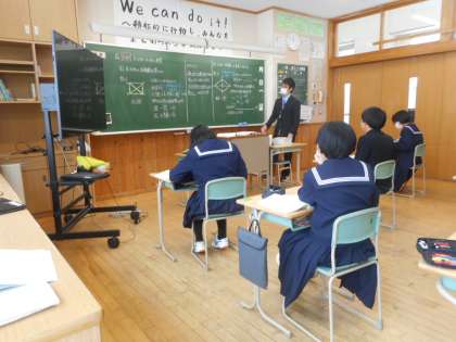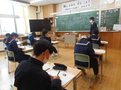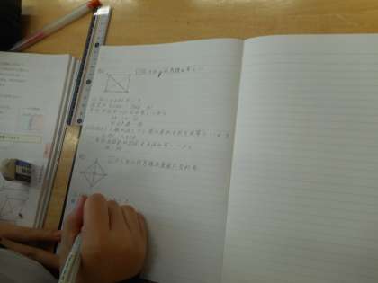 本日の授業は、特別な平行四辺形について学習します。特別な平行四辺形である長方形、ひし形、正方形の定義や性質を確認した上で、証明問題に取り組みます。手順を周囲の生徒と確認する姿が見られました。