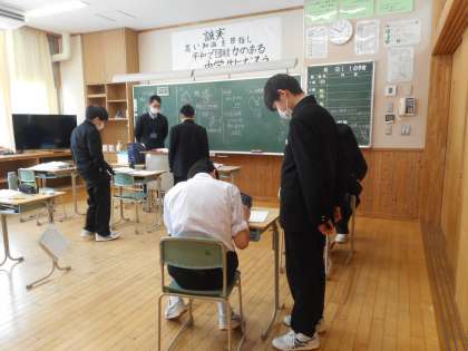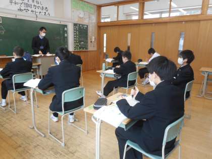本日の授業は、円錐の展開図を正しく書くことを学習します。底面の円周とおうぎ形のどこの長さが等しいかを考えて、中心角を求めます。生徒は、展開図を2回作図した後で、周囲の生徒と確認している姿が見られました。