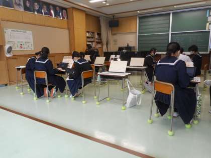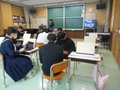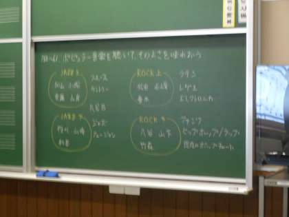本日の学習は、「ポピュラー音楽を聴いて、そのよさを味わおう」です。事前アンケートでロックとジャズの4つの班に分かれ、各班で紹介したい曲を端末から選曲し、次回発表します。生徒は、よさや感想を端末に記入しながら曲決めをします。