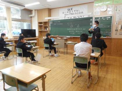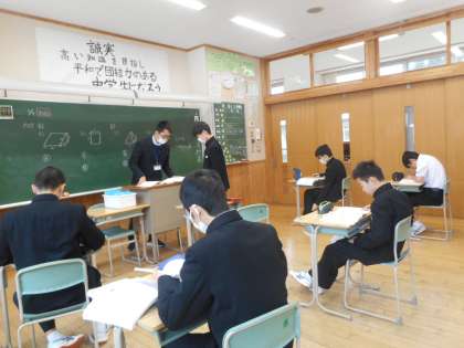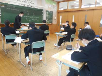 授業開始時に、角柱、角錐の体積の求め方について復習し、教科担任と確認しました。