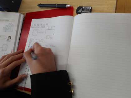 本日の授業は、円柱の表面積です。正確な展開図を書いて、円周と長方形のどの辺の長さが、等しいかを考えることで表面積を求めます。1年生の黒板に、本日の目標「数学をがんばろう」と大きく書かれていました。全員が達成できたと思います。
