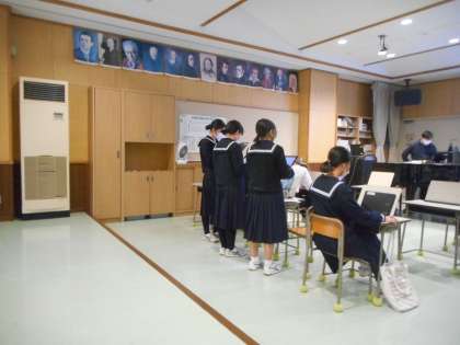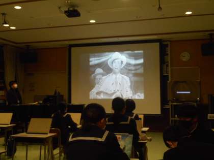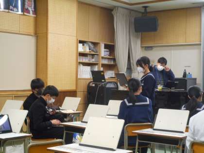 本日の授業は、選曲したポピュラー音楽について、発表します。ジャズとロックに分かれた4つの班が、曲のよさ、リズム、特徴等について発表します。発表後は、スクリーンを見ながら視聴し、曲の感想をワークシートにまとめます。