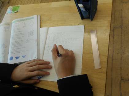 本日の授業は、これまでの復習として、章の問題に取り組みます。四角柱、五角柱の立体図形から、平行、垂直、ねじれの位置にある辺や面を考えます。生徒は、見落とした辺や面を確認しながら、確かな理解に繋げます。