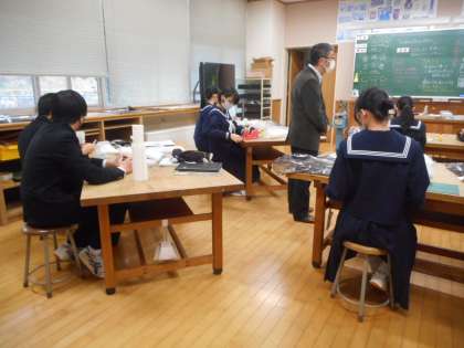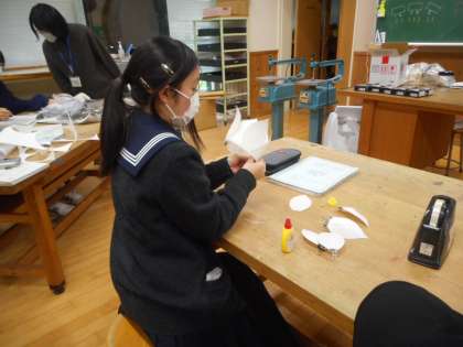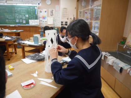 3年生の3・4限は、美術の授業です。光を透過する素材でデザインしたランプシェードを仕上げます。全員の作品が完成した後は、家庭科室で展示する予定です。全校で鑑賞して味わいます。