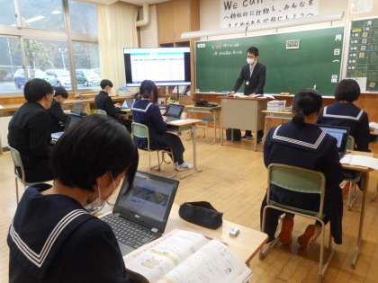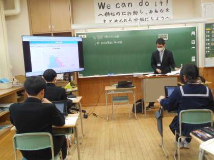 本日の授業は、「データを比較して判断しよう」です。ある店のスナック菓子の売れた個数のデータを花見期間と直前期間、さらに平日と休日に分けた4つのヒストグラムから、どのようなことが読み取れるかを考えます。各自ノートにまとめ、発表します。