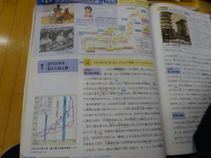 2年生社会科の授業の様子です。近代日本の軽工業、重工業の発展について学習しました。幕末に外国との貿易を開始し、戦争等を経て産業が発展していった様子を、当時の写真やデータを確認しながら理解しました。