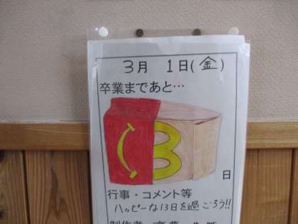 今日から3月でした。3年教室には、卒業式までのカウントダウンカレンダーが掲示してあります。