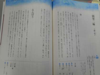 本日の授業は、筆者の思いや考えがいろいろな表現で書かれている随筆の学習です。生徒は、工藤直子作の随筆二編を朗読した後、場面の描写を基に筆者の思いや考えを捉えます。