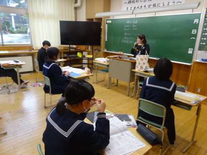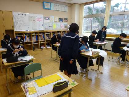 家庭科の授業でブックカバーの模様を刺繍しました。普段は話し合いながら活動を進めることの多い2年生ですが、黙々と取り組み、制作に集中していました。