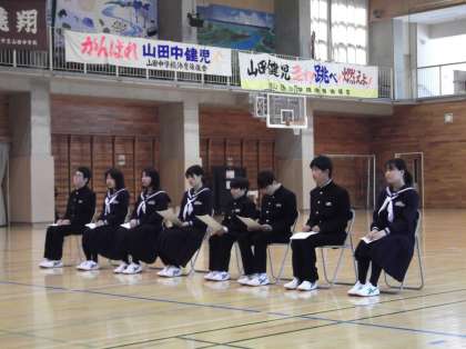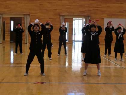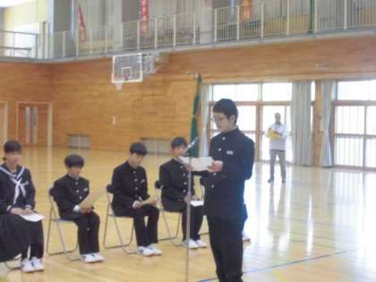 5限に、生徒会入会式を行いました。新入生代表が入会の言葉を述べた後、在校生がエールや校歌で歓迎しました。その後、在校生から学校生活や生徒会活動についての紹介があり、新入生は集中して発表を聞いていました。