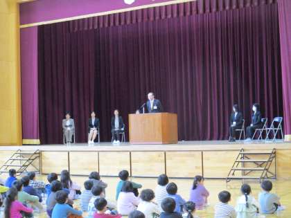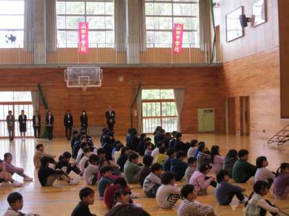 5限は、小中合同着任式を行いました。小学1年生から中学3年生までが初めて揃い、新しく山田小・中学校に仲間入りした教職員を迎えました。