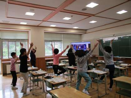 小学校6年生の授業の様子です。児童たちは、チャンツのリズムにのって体を動かしながら、楽しく英語を学習していました。