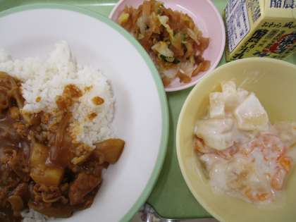 今日の給食は、カレーライス、牛乳、福神和え、フルーツヨーグルトです。カレーライスは、配膳が大変な献立の一つですが、協力して配膳しました。