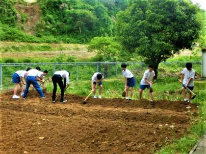 2年生の技術です。作物の栽培に先立って、手分けして畝(うね)を作りました。